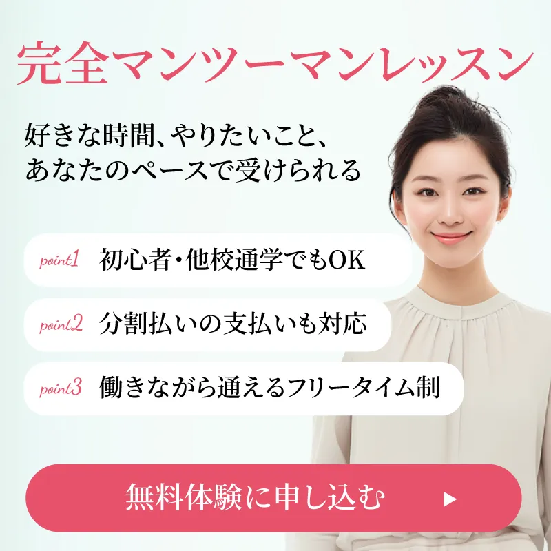 お仕事のあと、子育ての合間など、生活リズムに合わせて通学可能。 完全マンツーマンだから、曜日や時間の調整もしやすく、妊娠・出産などライフイベントにも配慮いたします。 「できる日だけ」「週1回だけ」など、あなたのペースで通えます。