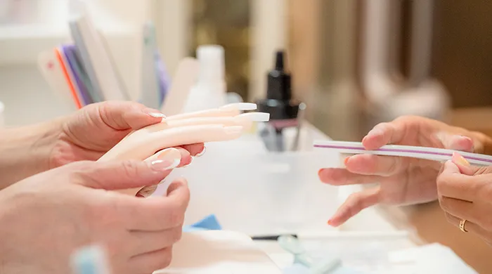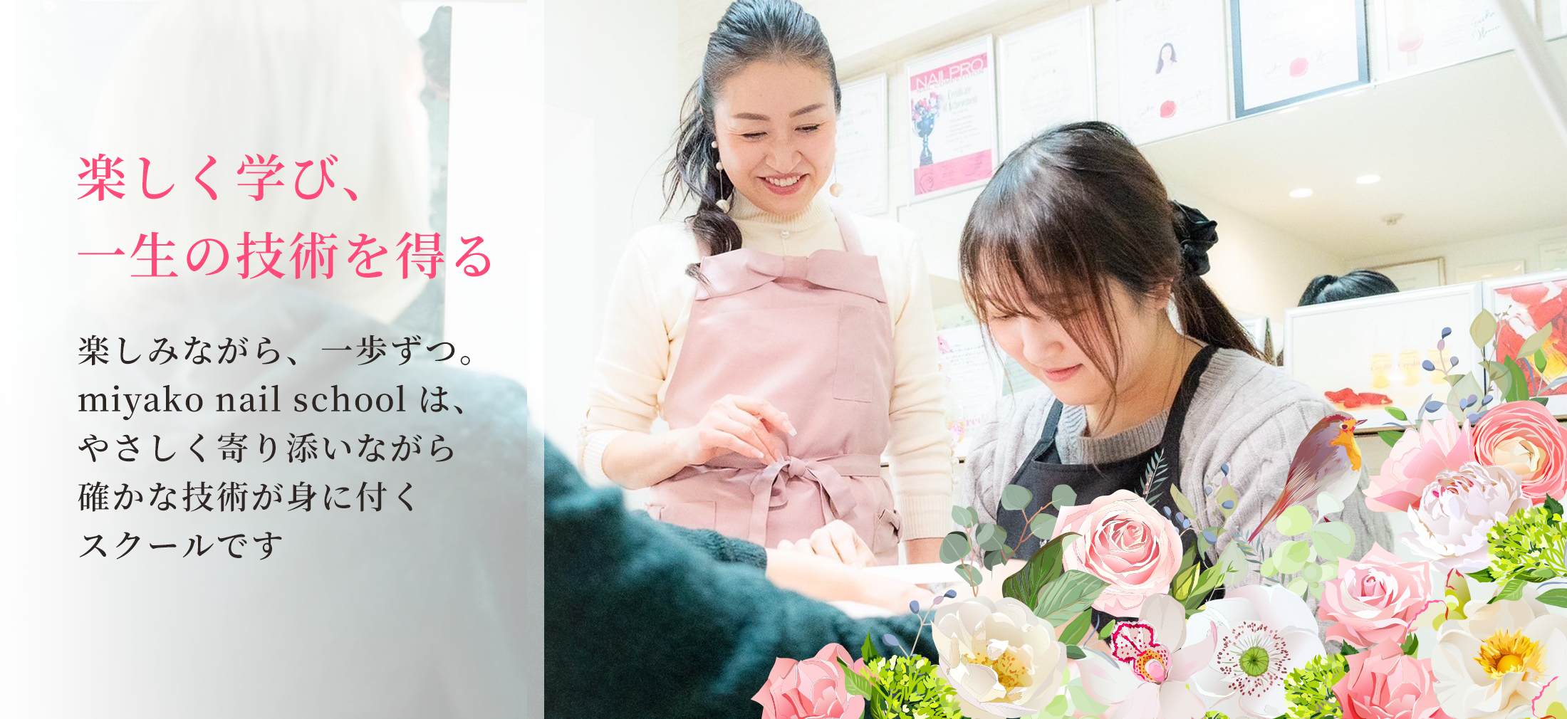 MIYAKOネイルスクールでは、在学中から本物のお客様の手をお借りして実践練習が可能。